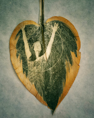 I find the organic nature of chlorophyll printing seductive. Leaves from my backyard, endless hours of sunlight, and a positive image on transparency- sandwiched between 2 pieces of glass- are all I need. Well, that-- and time. The beauty, simplicity, and ephemerality of chlorophyll printing seems just about right during these many months of lockdown, when time is all we have. Arranging these figurative images within the restrictive confines of the leaf's shape serves as a metaphor, offering just one interpretation of a life- that no matter how oddly shaped or seemingly marred-- it remains within the subjective confines of an imperfect kind of beauty.